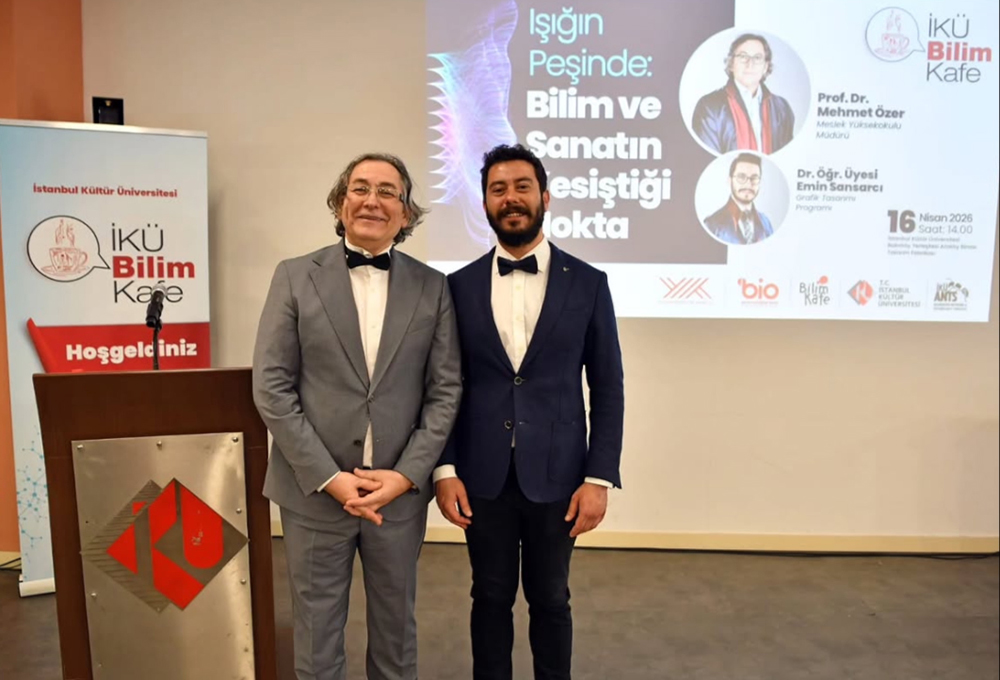 İKÜ Meslek Yüksekokulu (MYO) tarafından, "İKÜ Bilim Kafe" etkinlikleri kapsamında 16 Nisan 2026 Perşembe günü Bakırköy yerleşkesi Ataköy binasındaki Tasarım Fabrikası'nda “Işığın Peşinde: Bilim ve Sanatın Kesiştiği Nokta” başlıklı söyleşi düzenlendi. MYO Müdürümüz Prof. Dr. Mehmet Özer ile Grafik Tasarımı Programı akademisyenlerimizden Dr. Öğr. Üyesi Emin Sansarcı’nın konuşmacı oldukları etkinlikte; bilimin estetikle nasıl iç içe geçtiği katılımcılara aktarıldı. İnteraktif şekilde ilerleyen etkinlikte, disiplinlerarası bakış açısının ne kadar güçlü olduğu bir kez daha deneyimlendi.