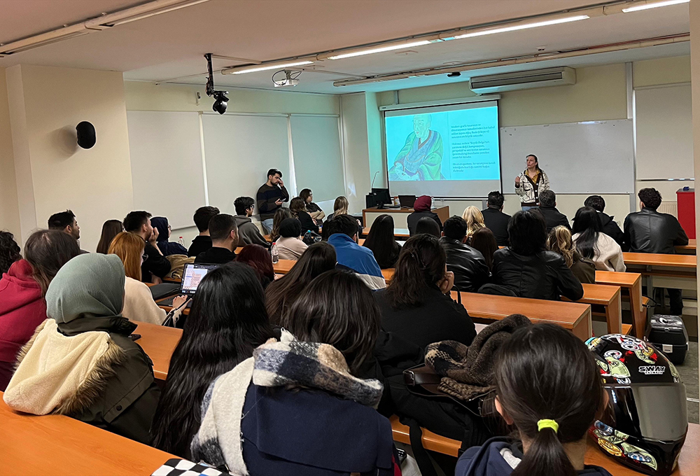Grafik Tasarımı Programı ile Farkındaysan Kulübü iş birliğinde, 24 Mart 2026 Salı günü Bakırköy yerleşkesi İncirli binasındaki 4A01 numaralı amfide "Grafik Atölyeleri 1: Çoğaltılabilir Sanat ve Sürdürülebilir Baskı" başlıklı söyleşi düzenlendi. Proje yürütücülüğünü Dr. Öğr. Üyesi Ömür Kınay Alkan'ın üstlendiği etkinliğe, Multidisipliner Sanatçı Çiğdem Şenyürek konuşmacı olarak katıldı. Etkinlikte; çoğaltılabilir sanat, sürdürülebilir baskı teknikleri ve alternatif üretim yöntemleri üzerine kapsamlı bir paylaşım gerçekleştirildi. Söyleşi boyunca katılımcılar, sürdürülebilir sanat ve baskı tekniklerine dair teorik bilgiler edinme fırsatı buldu.